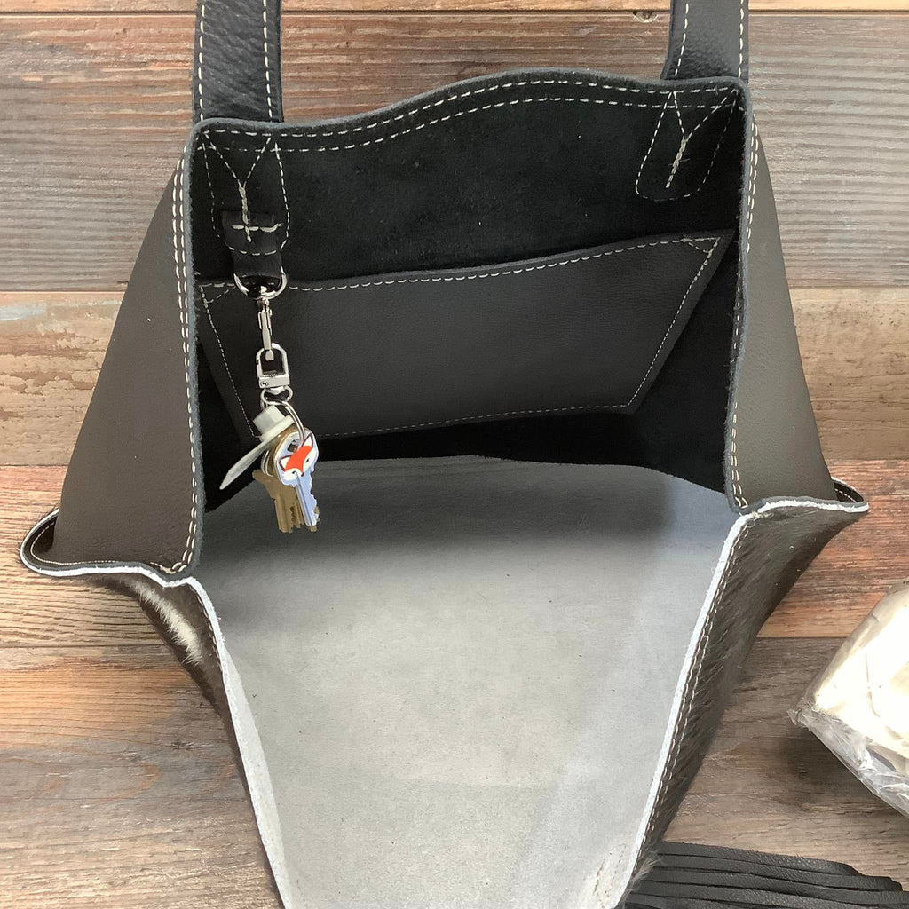 This stunning and versatile tote bag is a must-have for weekend getaways and extended shopping trips. Large enough to fit all your essentials and then some, this hair-on hide bag is soft-sided and lightweight, perfect to throw over your shoulder to keep your hands free. Its interior and exterior pockets and interior clip keep your belongings safe and secure. Each bag in the collection is finished with beauty, the leather handles that are tapered at the top for comfort, and a delightful leather tassel to complete the cowgirl chic look.